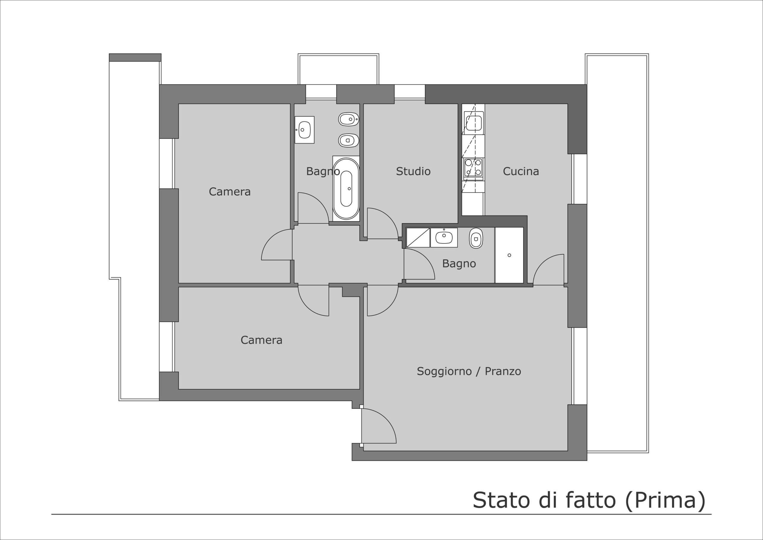 Per risparmiare spazio e ridurre il numero dei disimpegni i bagni sono stati concentrati in un’unica zona dell’appartamento mentre la lavatrice e la dispensa/lavanderia sono collocate a ridosso della cucina in prossimità del terrazzo di servizio.